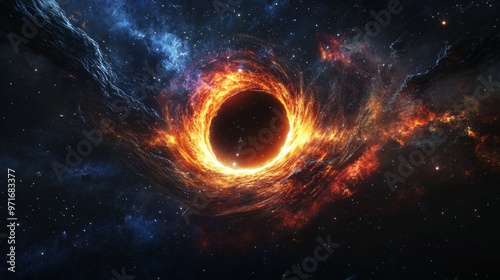 Massive black hole devouring a distant star amidst vivid nebulae in a dramatic cosmic backdrop
