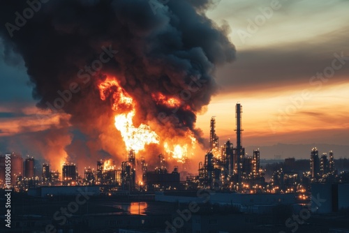 Massive industrial fire with thick black smoke and flames engulfing a refinery at sunset, highlighting environmental disaster and emergency response challenges