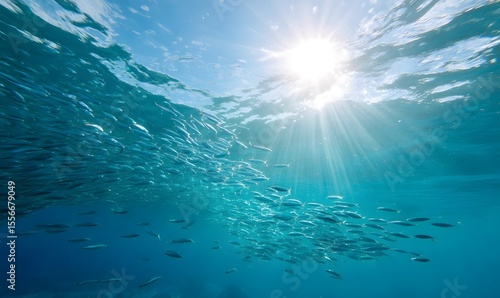 massive shimmering school of sardines swirling in clear tropical blue water, Generative AI