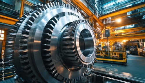 Massive steel gear in an industrial setting, symbolizing precision engineering and mechanical power.