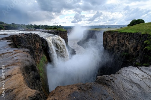 Massive waterfall plunging into a deep canyon, mist rising as the powerful currents crash into the rocks below