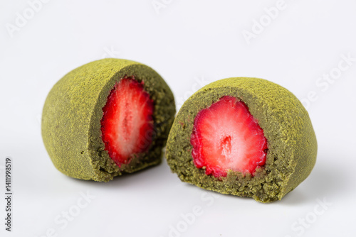 Matcha mochi dessert filled with fresh strawberry, sliced open showing vibrant red fruit, soft texture, tasty and sweet