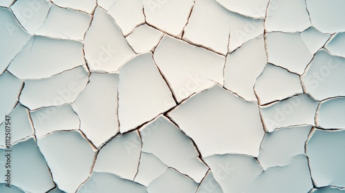 material science ceramics. A close-up of cracked, peeling paint on a surface, showcasing an abstract pattern of broken fragments in soft, muted colors.