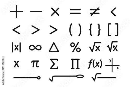 Mathematical symbols vector line art set. Icons for math, algebra, and geometry. Includes plus, minus, infinity, pi, sigma, square root, and function symbols for education.