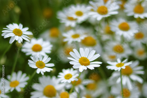 Matricaria Recutita. Flowering Chamomile. Wild Chamomile in summer meadow. Chamomile field. Beautiful blooming medical chamomiles.