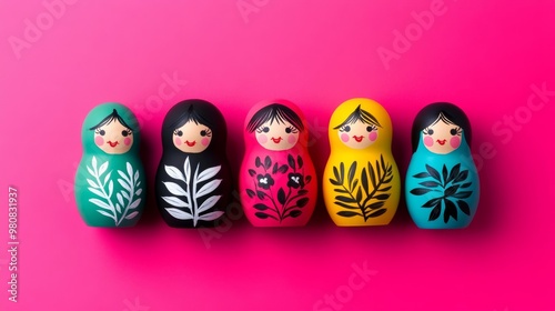 Matryoshka dolls in vibrant colors with intricate floral designs isolated on a bright pink background