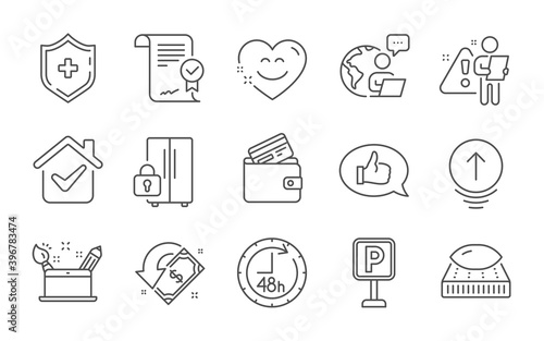 Mattress, Swipe up and Refrigerator line icons set. 48 hours, Debit card and Feedback signs. Approved agreement, Medical shield and Smile chat symbols. Line icons set. Vector