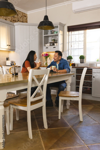 Mature Asian couple enjoying coffee and conversation at kitchen table, feeling relaxed