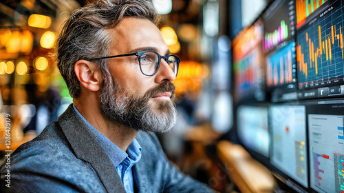 Mature businessman analyzing financial trading charts on multiple screens. Market investment, data analytics and forex with real time statistics finance business