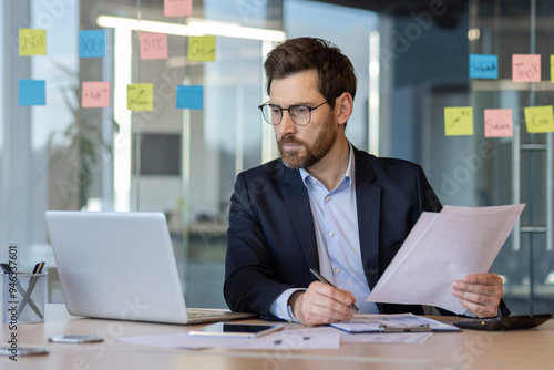 Mature businessman focused on analyzing documents and data in modern office. Seated at desk with laptop, pen, and paper, he exhibits concentration and professionalism. Concept of leadership