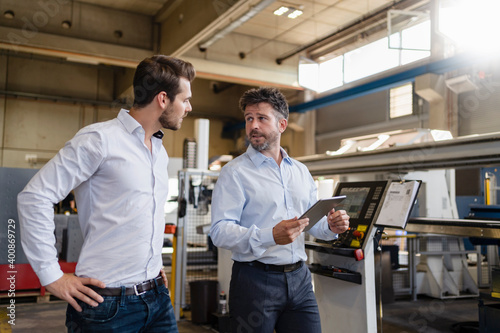 Mature businesswoman using digital tablet while discussing with colleague at factory
