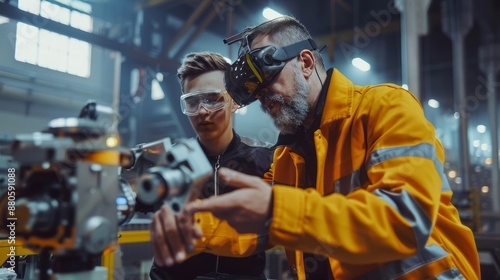 Mature engineer in a jacket explaining robotics technology to a young man in an industrial setting, showcasing advanced machinery and collaborative work environment, ideal for business presentations a