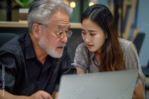 Mature Latin manager mentor talking to young Asian female coworker showing online project results at meeting. Two happy diverse professional executives team working in office using pc laptop