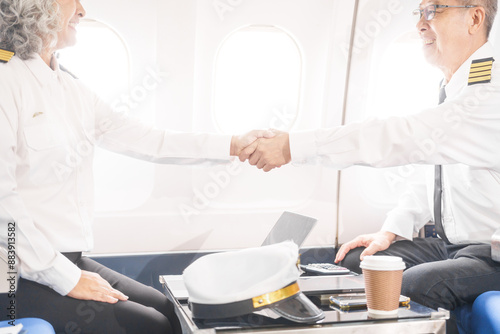 Mature male and female pilots meet inside an airplane, holding hands. Their gesture signifies teamwork, trust, and camaraderie in aviation, fostering a safe and collaborative work environment.