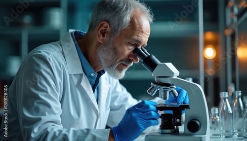 Mature male researcher studies samples using microscope in lab. Scientist in gloves, lab coat examines substance, conducts experiment. Microbiological, biotechnology expertise, pharmaceutical