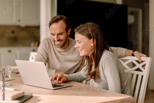 Mature man sitting by happy daughter using laptop for studying at home