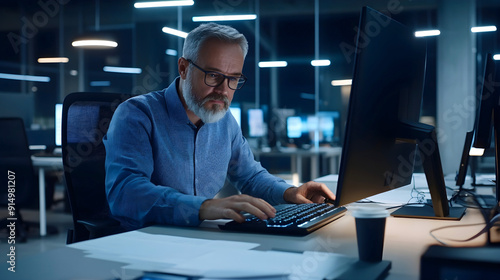 Mature man working late at a computer in a dimly lit office, focused on his tasks in a technology-driven environment