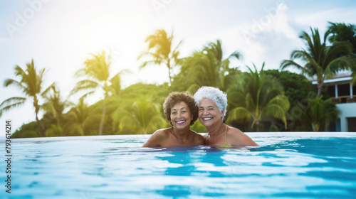 Mature women on vacation in tropical resort, married female couple spend time together in swimming pool, moments of life, senior active friends on travel, palms on the background, holiday memory photo
