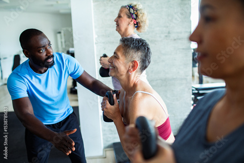 Mature women working out at gym with personal trainer guiding
