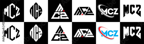 MCZ letter logo design in six style. MCZ polygon, circle, triangle, hexagon, flat and simple style with black and white color variation letter logo set in one artboard. MCZ minimalist and classic logo
