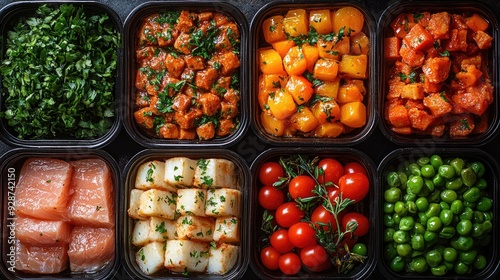 Meal Prep Containers with Various Vegetables, Meat, and Herbs
