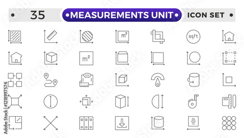 Measurement outline icons set with Measure, Area, Dimension, Distance, Diameter, Meter, Width, Radius, Length, weight and volume. Contains such icons as ruler, m2, area and more.