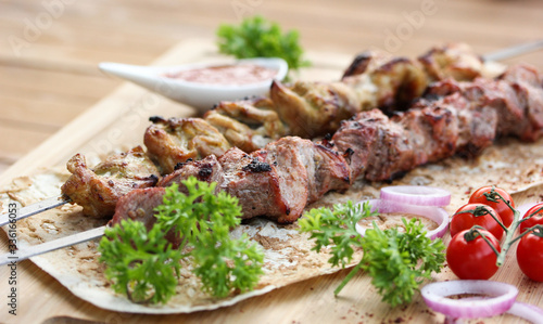 Meat and chicken skewers on pita bread with parsley, onion and cherry tomatoes on a wooden table. Ketchup in a bowl. Picnic. Fried meat on the fire. Background image, copy space