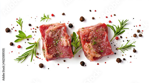 Meat pork with herbs and spices, floating in the air. on a white background, 3d illustration.