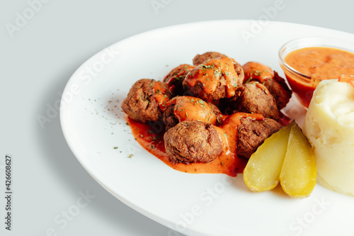 Meatballs with tomato sauces, mashed potatoes and pickles.