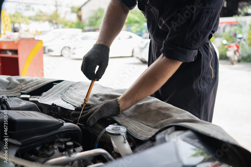 Mechanic changing engine, service car workshop automobile. professional man shop maintenance
