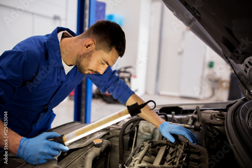 mechanic man with lamp repairing car at workshop