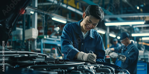 Mechanic working efficiently on a car engine in an auto repair shop, smiling professional technician, automotive workshop concept