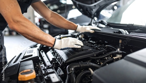 Mechanic working on car engine in auto repair shop with car service and maintenance.