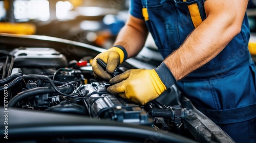 Mechanic working on car engine, wearing gloves and focused on maintenance task.