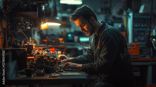 Mechanic working on car engine wiring in a welllit garage, surrounded by tools and machinery, focused expression, highdetail, realistic lighting, 8K UHD