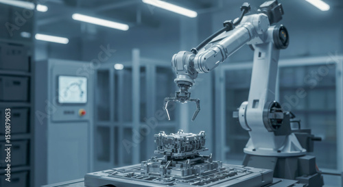 Mechanical arms spark and grip, welding engine parts in a sleek smart factory. The blue glow reveals a world where robotics lead industrial progress and human roles are redefined.