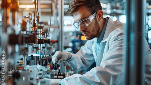 Mechanical engineer testing a prototype in a laboratory setting. The engineer is using sophisticated testing equipment to measure the performance and durability of the mechanical system. The lab is