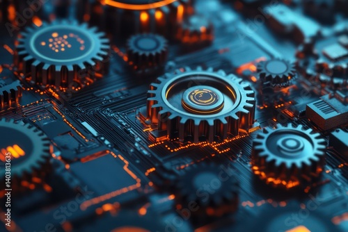 Mechanical gears seamlessly blending into digital interfaces, indicating the integration of AI in automation, precise and modern design,