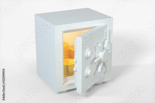Mechanical safe, with shiny golden coins inside, 3d rendering.