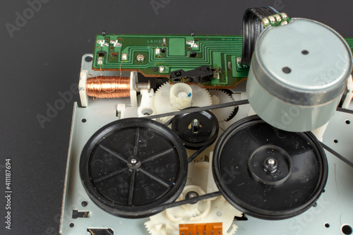 Mechanism for a tape recorder with gears in an exploded view close-up