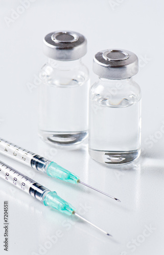 medical ampoules and syringe on white background