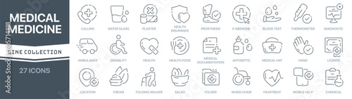 Medical and medicine linear signed icon collection. Signed thin line icons collection. Set of medical and medicine simple outline icons