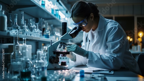 Medical Development Laboratory: Scientist Looking Under Microscope, Analyzes Petri Dish Sample. Specialists Working on Medicine
