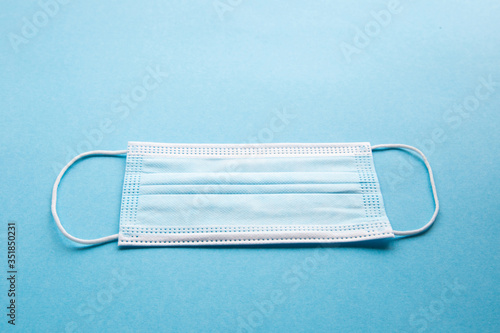 Medical face masks with on a blue background with copy space. Coronavirus pandemic prevention concept.