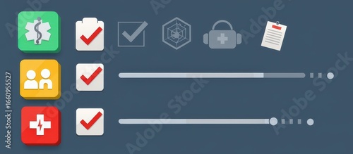 Medical icons and progress indicators on a dark background, symbolizing health and safety.
