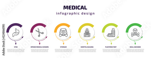 medical infographic template with icons and 6 step or option. medical icons such as stoh, opened medical scissors, sternum, hospital building front, plastered foot, skull and bone vector. can be