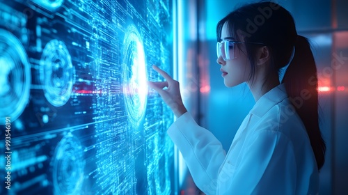 Medical lab specialist using hologram to analyze patient data, glowing blue and white light, futuristic sci-fi lab environment, vibrant color contrast, modern technology, cyberpunk digital art