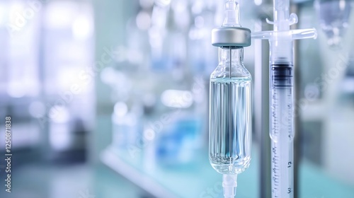 Medical Laboratory Setting Featuring a Glass Vial and Syringe Under Clinical Lighting for Healthcare Applications : Generative AI