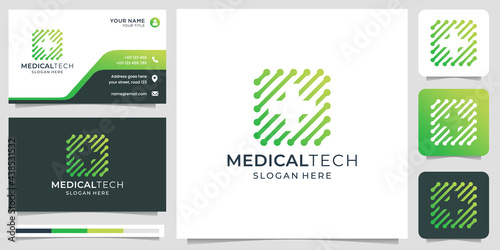 medical logo with creative technology in negative space concept design. logo and business card template. Premium vector