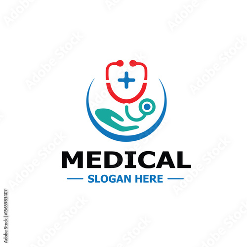 Medical Logo with Shield-Shaped Stethoscope, Cross Symbol & Helping Hand – Modern Healthcare Branding Design.